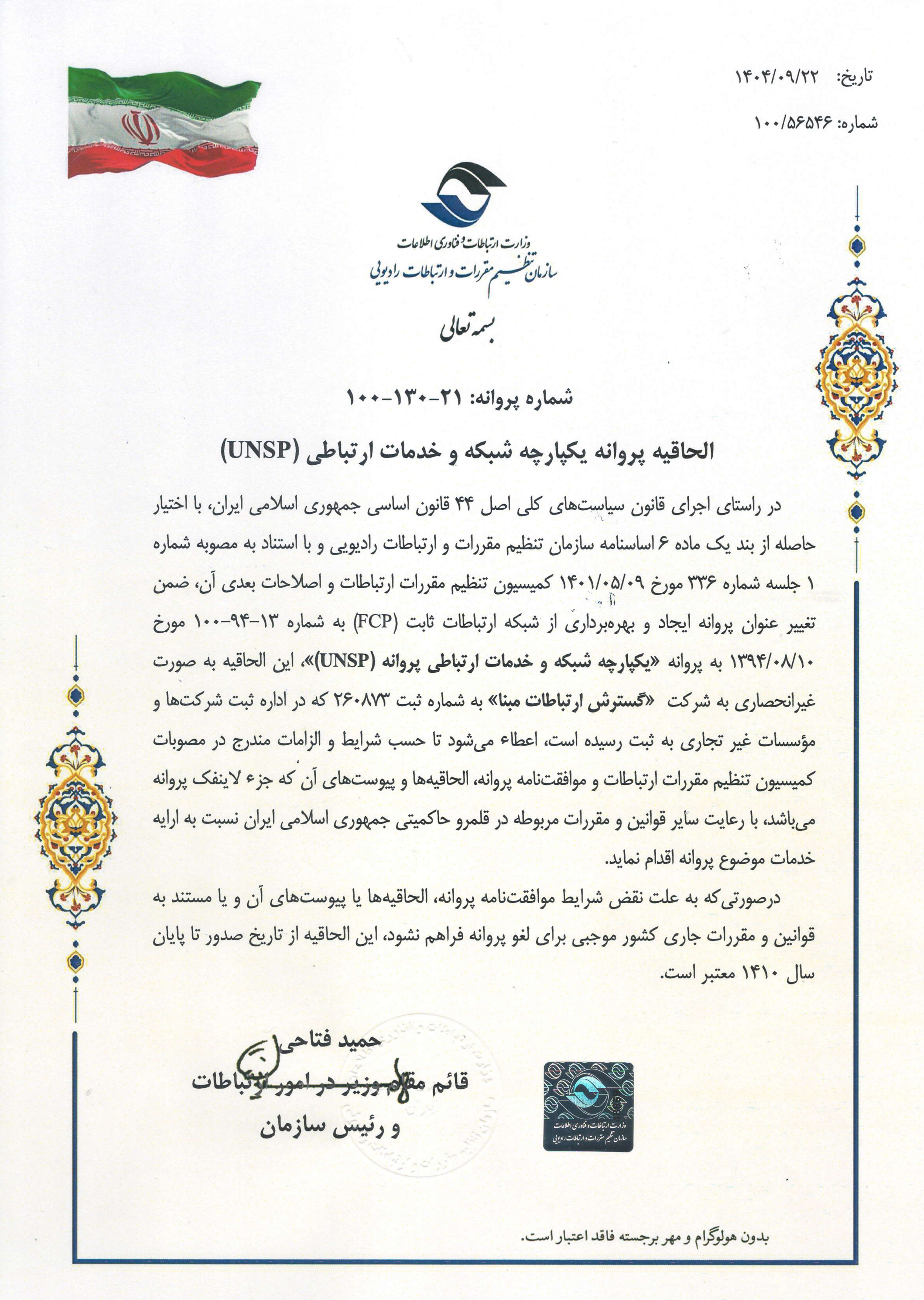 شرکت گسترش ارتباطات مبنا دارای مجوز رسمی UNSP به شماره پروانه : 21-130-100 از سازمان تنظیم مقررات و ارتباطات رادیویی ایران (www.cra.ir) میباشد.